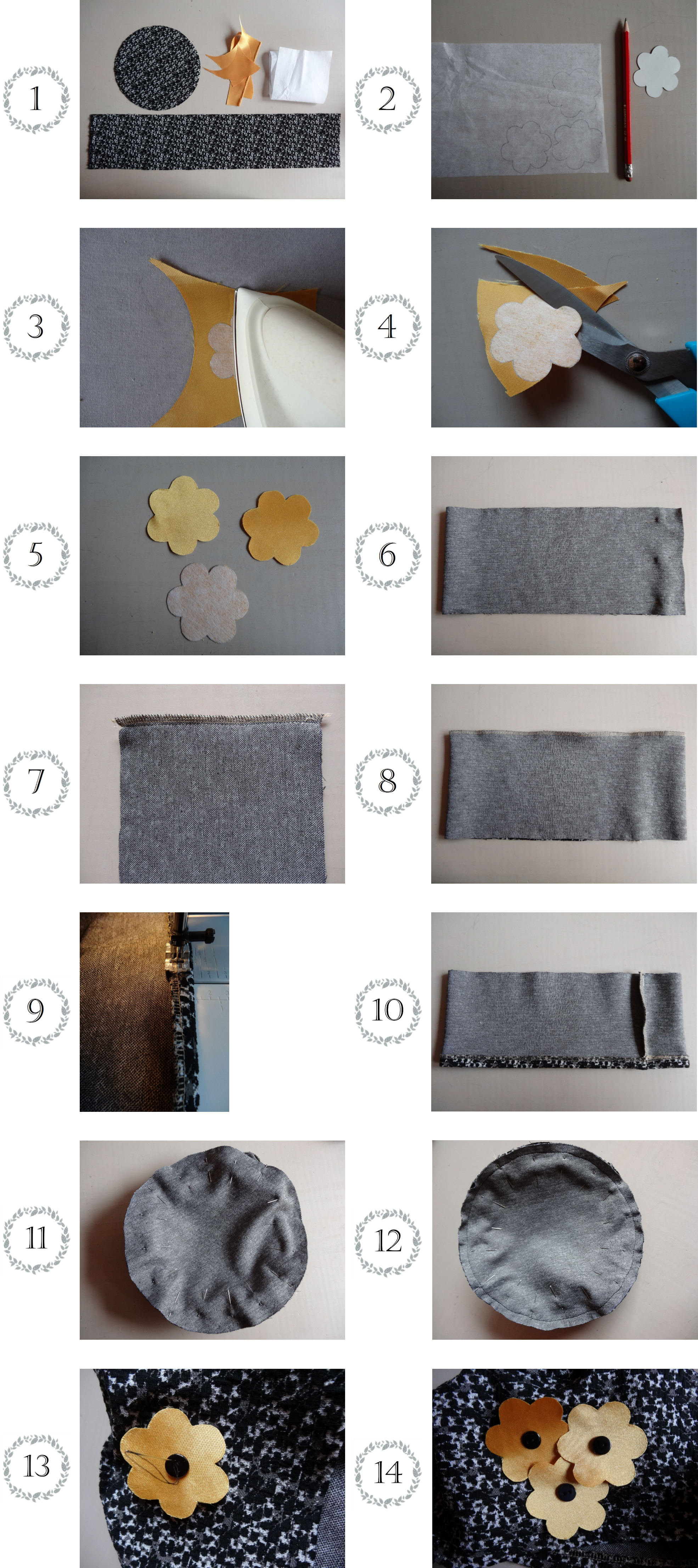 2. Préparez les fleurs en satin. A l’aide du gabarit, reproduire 3 fleurs sur le tissu thermocollant et les découper.